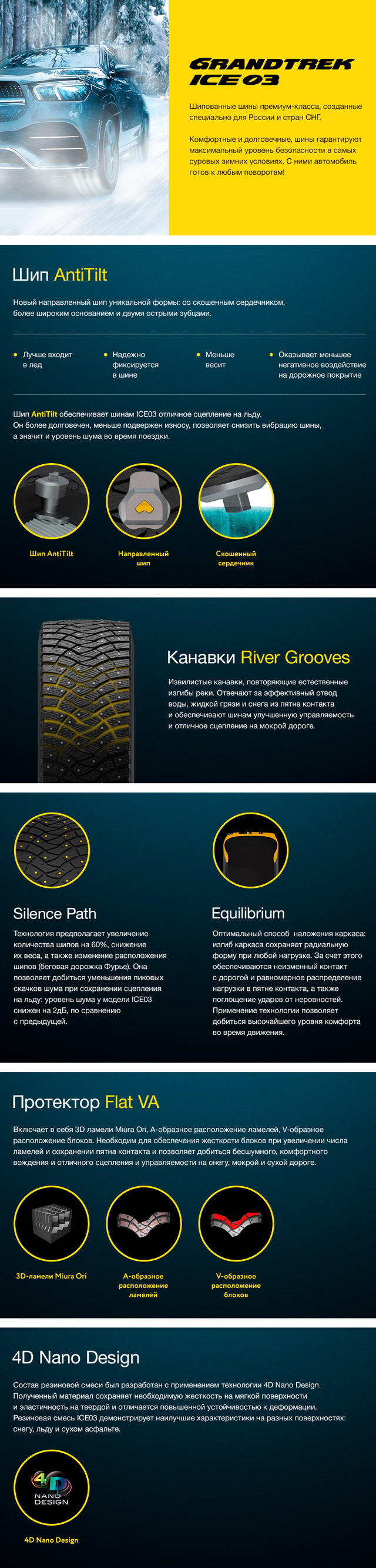 Dunlop Grandtrek Ice 03 — шипованные зимние шины для транспортных средств с высоким центром тяжести, адаптированные к самым суровым условиям эксплуатации. Они характеризуются стабильностью сцепных свойств, хорошей манёвренностью и эффективным торможением на зимних покрытиях, а кроме того безопасностью на мокрой и сухой поверхности, ездовым комфортом и длительностью срока эксплуатации.