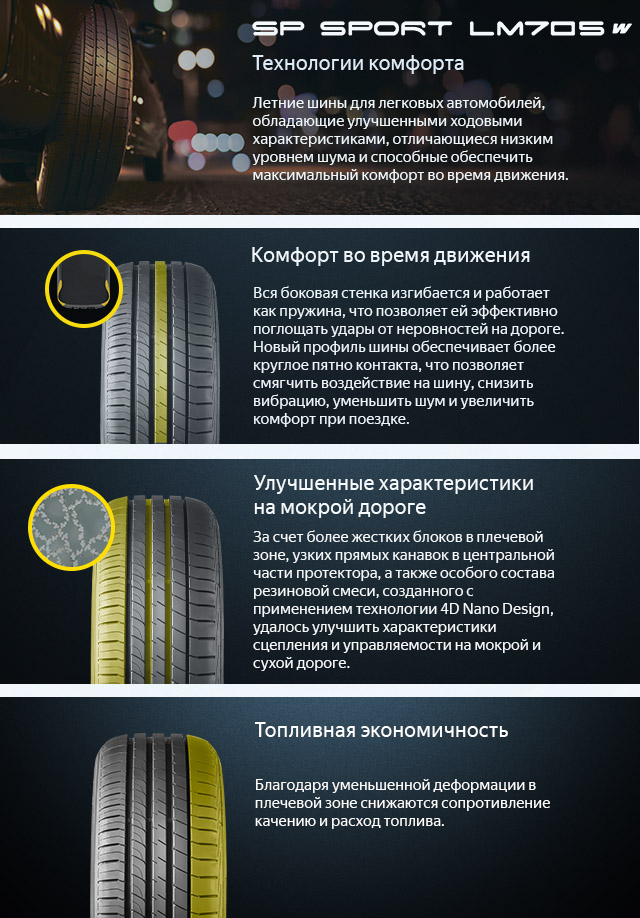 Кроме того, Dunlop SP Sport LM705w поглощает все вибрации, вызванные неровностями дорожного полотна, максимально снижая уровень генерируемого шума и обеспечивая плавную езду.